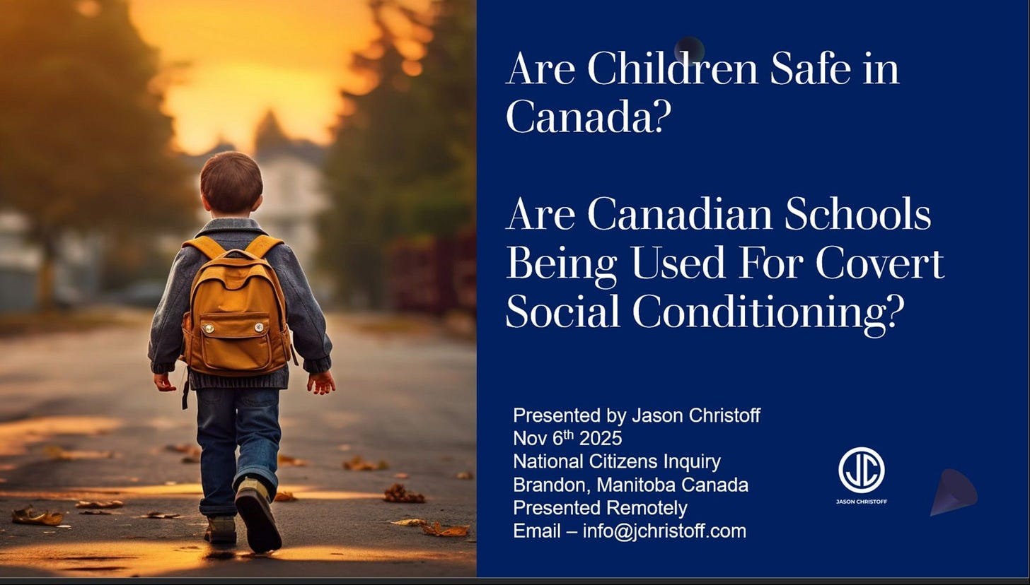 I Speak Again Nov 06, 2025 at Canada’s National Citizen’s Inquiry About Canadian Schools Being Used as Covert Social Conditioning Centers - although I’ll be polite during tomorrow’s testimony to the panel of investigators, I will indeed give a very hard-hitting factual review of the extreme danger all children face, if their parents decide to send them to government school.