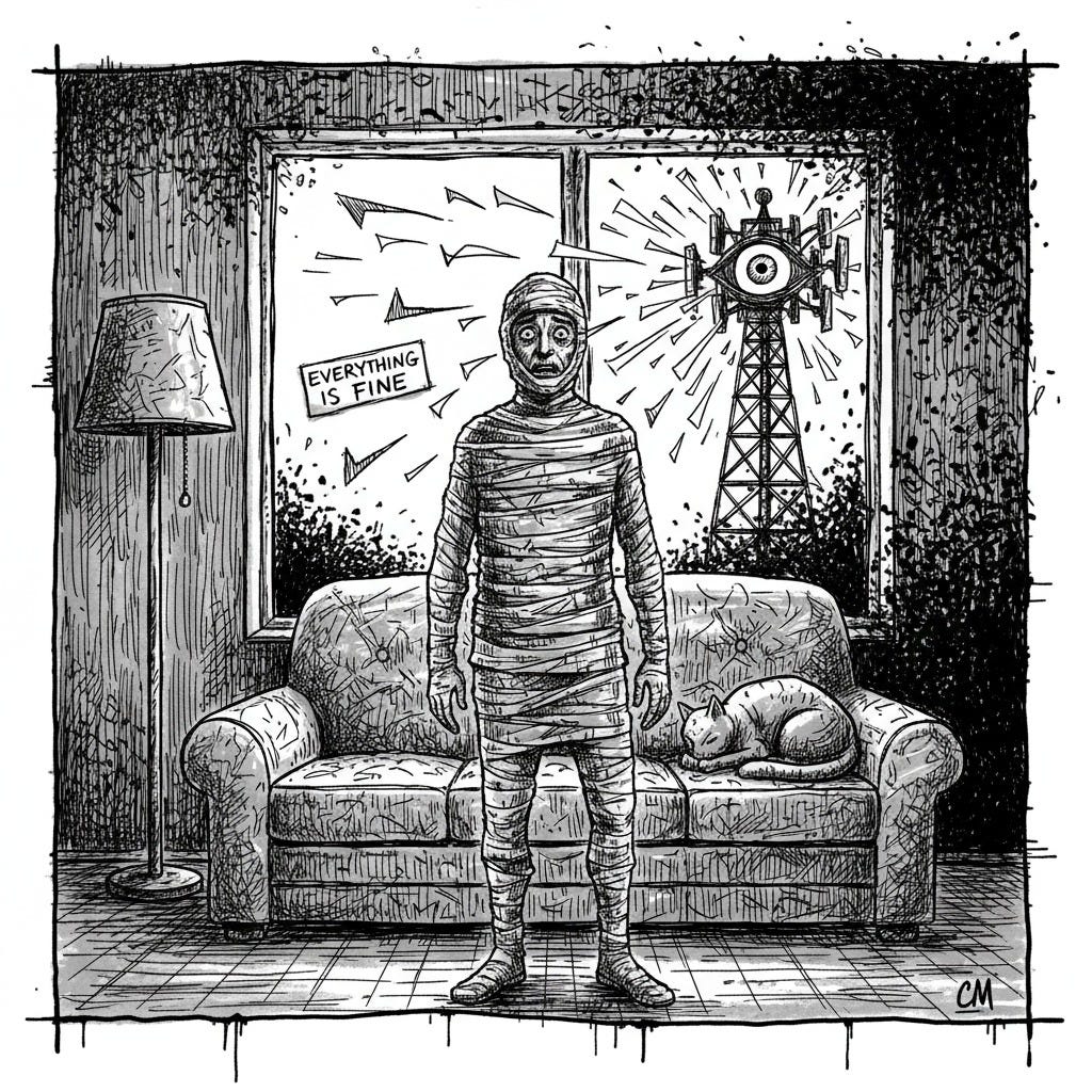 Step out of your house. Your phone immediately begins looking for a signal, punching through the air to connect with the nearest cell tower—a high-powered microwave transmitter disguised as a sad metal tree or hidden on a church steeple like a blasphemous gargoyle. Your neighbor's Wi-Fi router is pumping a 2.4 or 5 gigahertz signal straight through your walls, straight through your skull. The other neighbor's router is doing the same from the other side. A dozen more down the street are adding to the soup. Every car that drives by is a rolling bundle of Bluetooth chaos, its signals looking for a mate. Above you, satellites are raining down GPS data. Around you, the air itself crackles with the endless chatter of AM/FM radio, television broadcasts, police scanners, and the encrypted whispers of military comms.