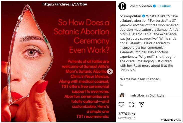 On November 16th, 2023 Cosmopolitan Magazine posted the following guidelines for satanic abortion rituals on their Instagram page. Here is their introduction along with four steps geared toward empowering yourself by murdering your child for Satan: