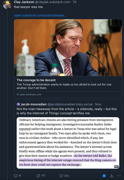 Yet most people still don’t give a shit. Most lawyers are indifferent. They’re fine being actors in an authoritarian play as long as their names stay on the Super Lawyers list. And they’ll continue using Ring while the regime uses the same technology to chill speech, intimidate, surveil immigrants, and erase due process. Continues at https://clayjak.substack.com/p/that-lawyer-was-me