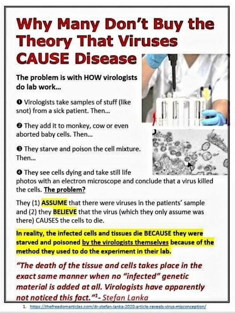 In the case of diseases, neither in the diseased organism nor in a bodily fluid has any structure, which you could characterize as a virus ever been seen or isolated 2 . The proposition that there is any illness causing virus whatsoever is a transparent swindle, a fatal lie with dramatic consequences. https://truthseeker.se/wp-content/uploads/No-Panic-Dr-Stefan-Lanka-on-Bird-Flu-AIDS-and-the-Corruption-of-Medicine.pdf