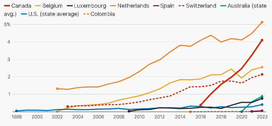 As Canada is poised to expand eligibility criteria under medical assistance in dying (MAID) legislation, data from all 11 countries where the controversial end-of-life treatment exists shows Canada is the fastest-growing adopter in history, an analysis by the Investigative Journalism Bureau and the Toronto Star has found.