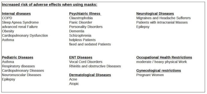 Up until now, there has been no comprehensive investigation as to the adverse health effects masks can cause. The aim was to find, test, evaluate and compile scientifically proven related side effects of wearing masks. For a quantitative evaluation, 44 mostly experimental studies were referenced, and for a substantive evaluation, 65 publications were found. The literature revealed relevant adverse effects of masks in numerous disciplines. In this paper, we refer to the psychological and physical deterioration as well as multiple symptoms described because of their consistent, recurrent and uniform presentation from different disciplines as a Mask-Induced Exhaustion Syndrome (MIES).