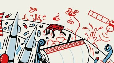 The red and blue container ship at the lower right corner, drawn as if it were firing, symbolizes that global trade has become a form of power struggle.
